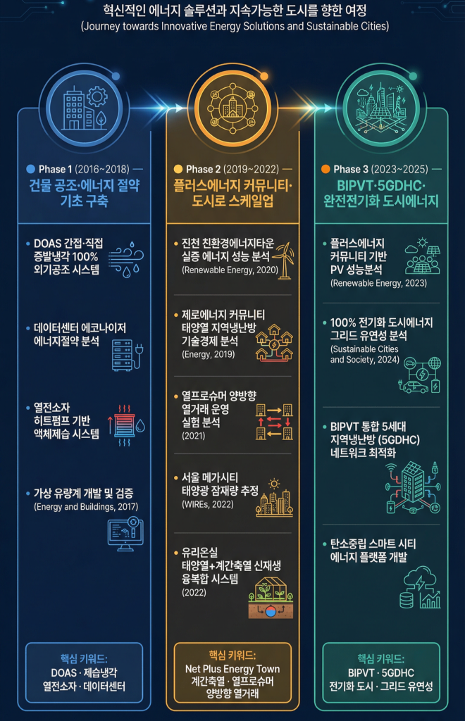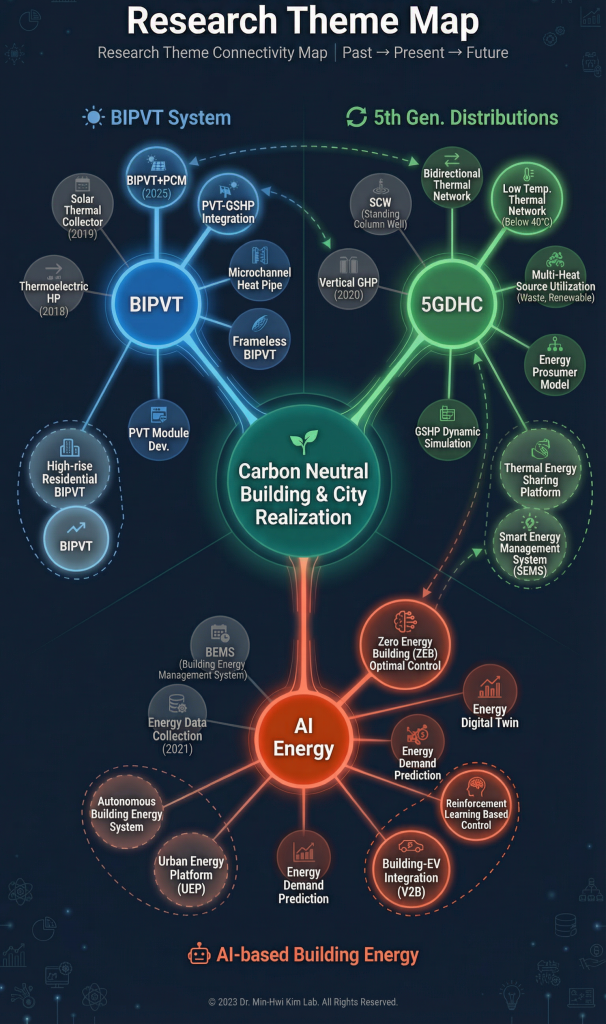 We are conducting various studies to realize a positive energy building/community beyond zero energy. In particular, we are conducting research on building-integrated renewable energy system technology, renewable energy convergence system implementation technology that combines various energy systems in a complex manner, and fifth-generation district heating and cooling system technology. He is participating in various domestic research projects and collaborating with various domestic and overseas institutions, and is presenting the results of his research at a number of international and domestic academic journals and international and domestic academic conferences. Ultimately, the vision is to contribute to the development of energy technologies for carbon neutrality in the building, agriculture, and urban sectors.